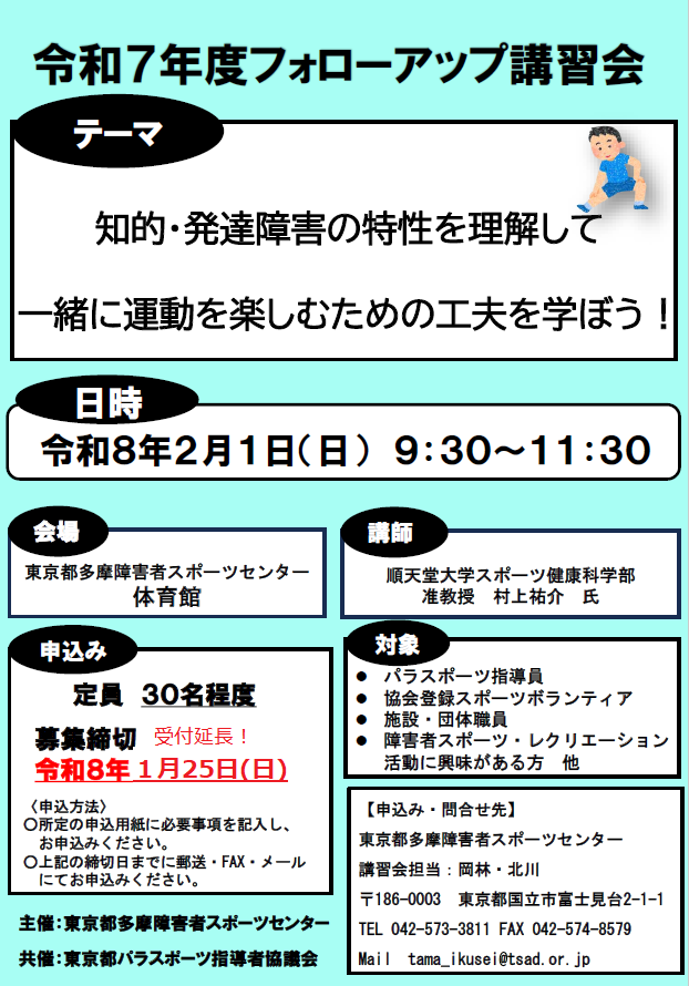 ※メールの場合は、件名に「令和7年度 初級パラスポーツ指導員養成講習会」と記載して下さい。記載のない場合は受信できない可能性があります。