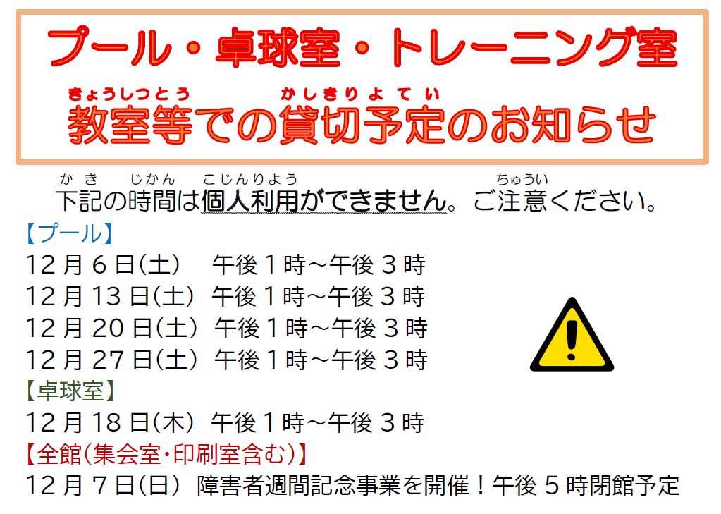 ・盗難等、当センターでは責任を負いかねますので、十分にご注意ください。また、当センターの備品の取り扱いには十分注意しお使いください。破損等が生じた場合は、弁償していただくことがございます。