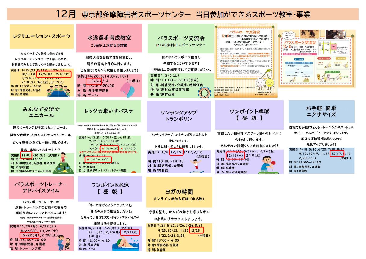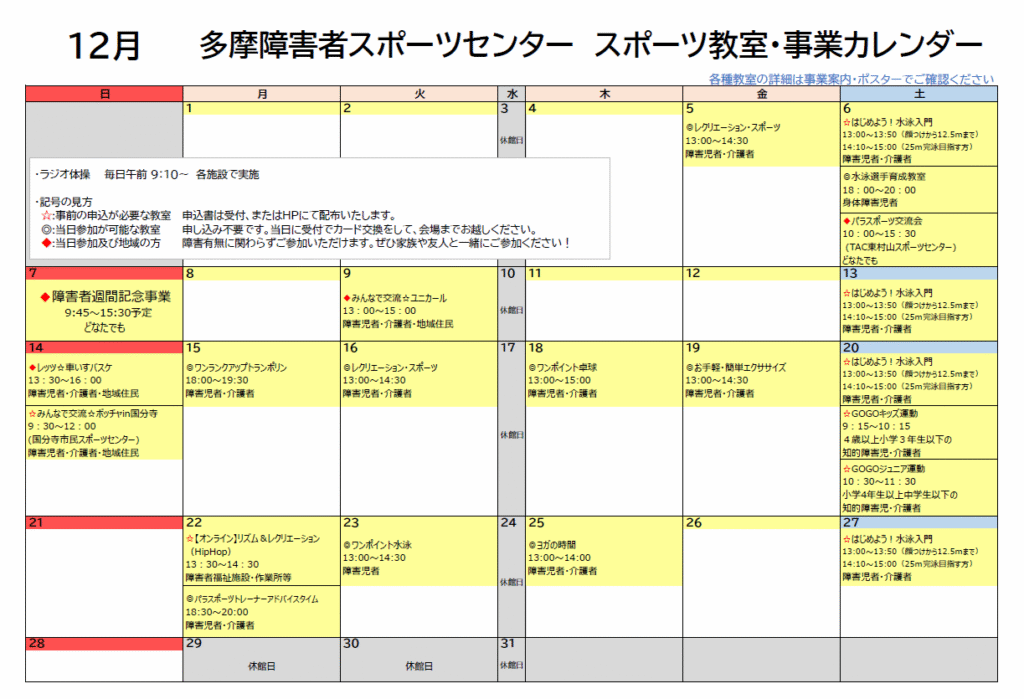 12月スポーツ教室カレンダー