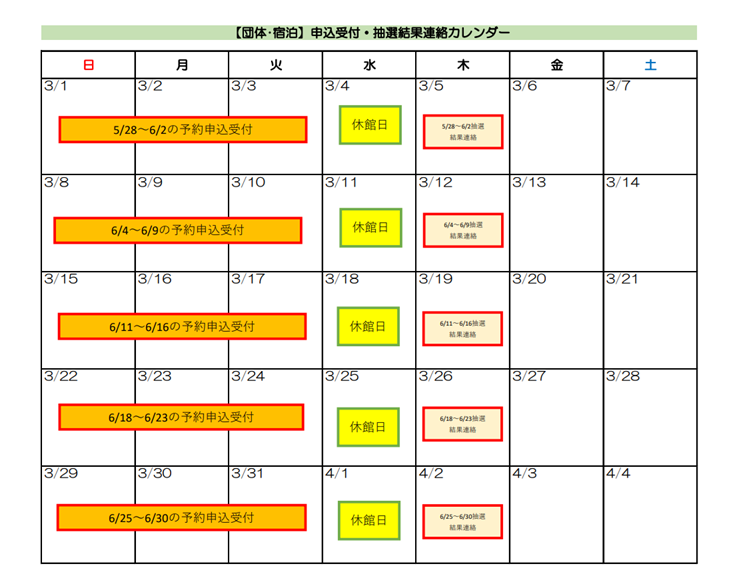 | 2/28 | 【団体・宿泊】申込受付・抽選結果連絡カレンダー |