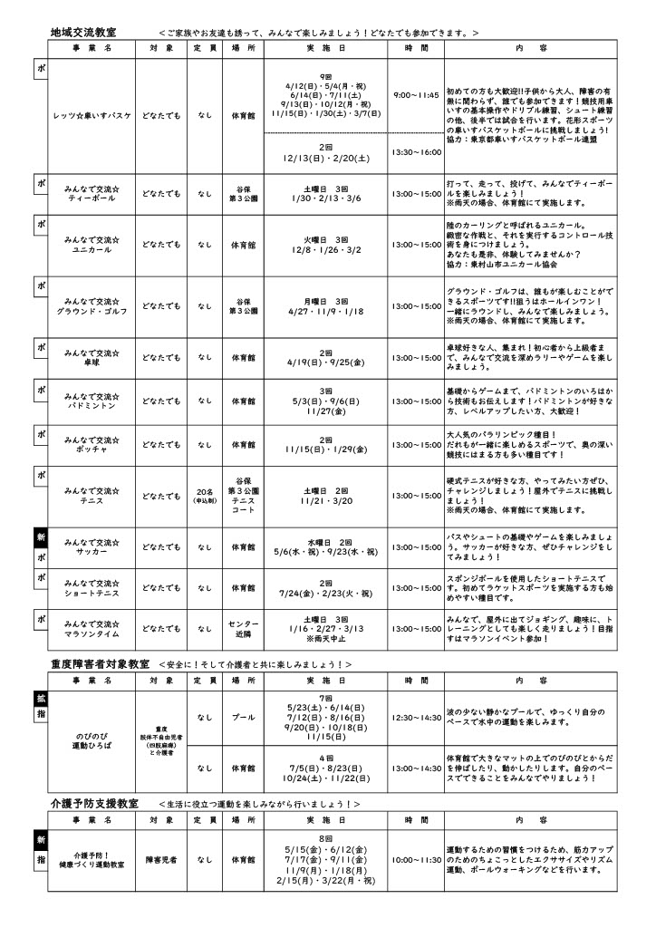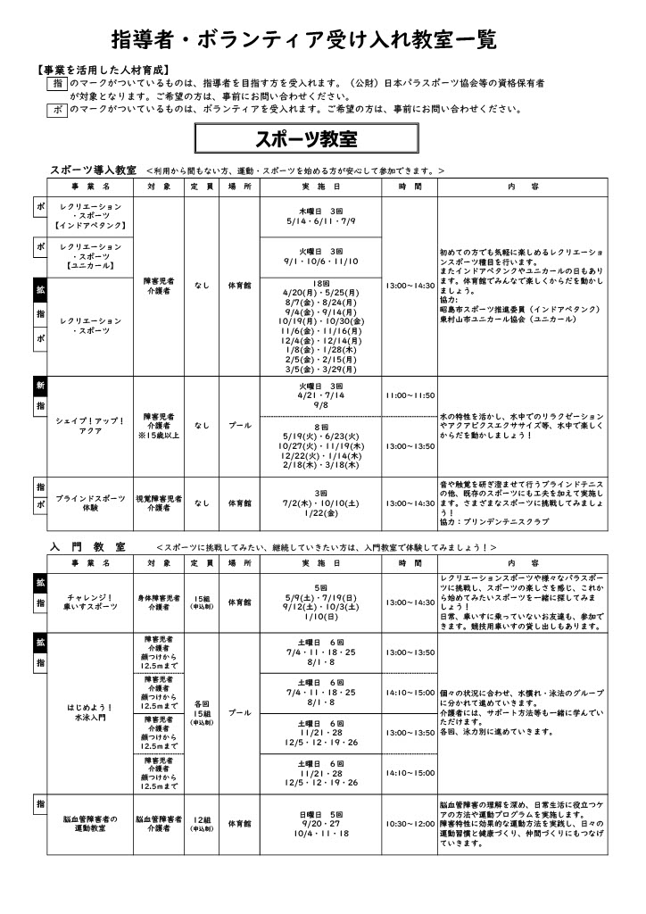 | 対象 | ・指導員としてのスキルアップを目指す方対象の教室…(公財)日本パラスポーツ協会等の資格保有者対象 ・ボランティア受け入れ対象教室…ボランティア希望の方対象 |