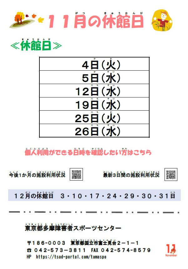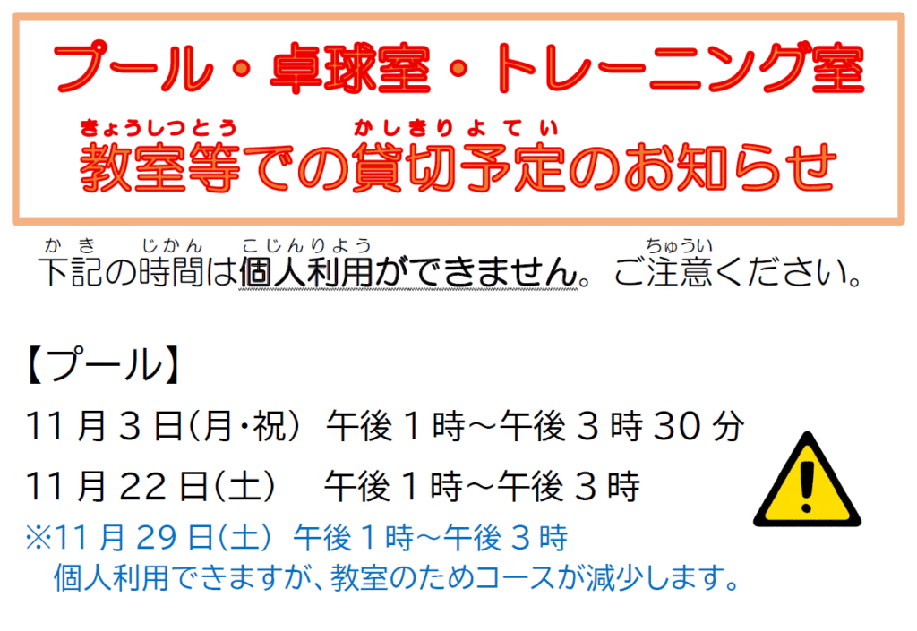 ★プール個人利用ができない日時 11月3日(月・祝) 午後1時~午後3時30分 11月22日(土) 午後1時~午後3時 ※11月29日(土) 午後1時~午後3時 個人利用できますが、教室のためコースが減少します。