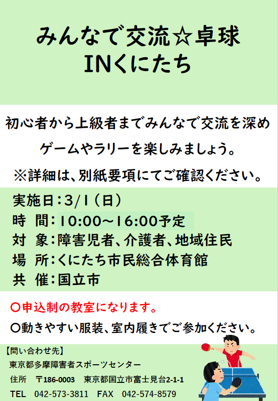 3/1(日)みんなで交流☆卓球inくにたち(国立市) 開催のお知らせ