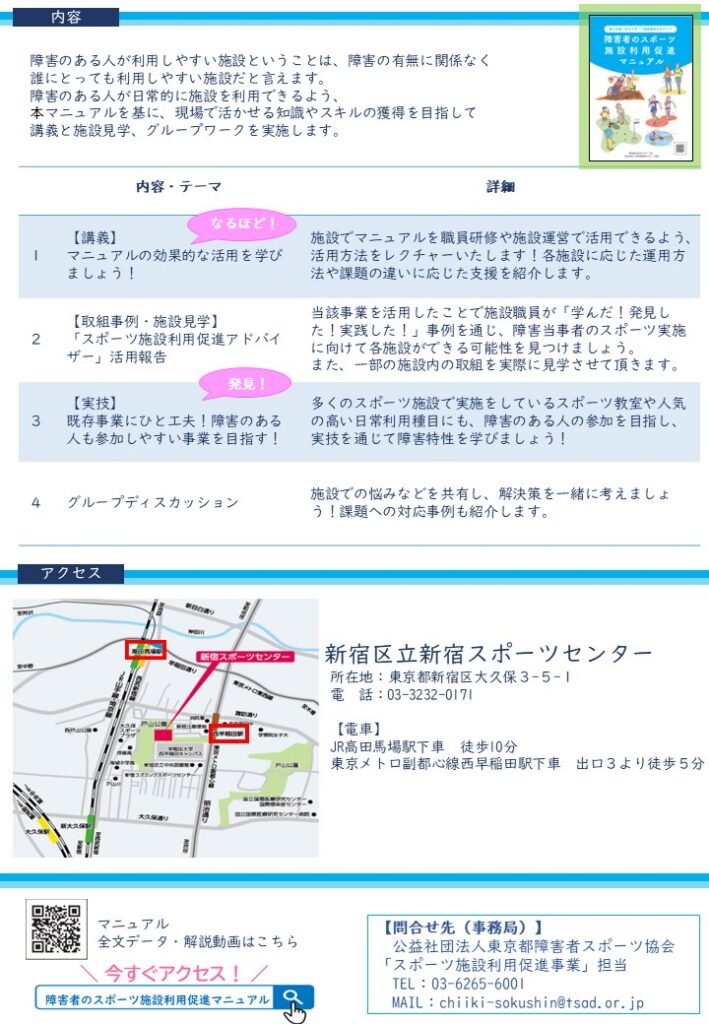地域におけるスポーツ実施の拠点となりうるスポーツ施設運営の実務者を対象に、各施設での日常的な障害者の受入につなげ、障害者のスポーツ施設利用促進への取組みのきっかけとなるよう研修会を開催いたします。